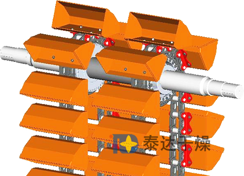 料斗把物料從下面的儲藏中舀起,隨著輸送帶或鏈提升到頂部,繞過頂輪后向下翻轉(zhuǎn), 斗式提升機將物料傾入接受槽內(nèi)。帶傳動的斗式提升機的傳動帶一般采用橡膠帶,裝在下或上面的傳動滾筒和上下面的改向滾筒上。鏈傳動的斗式提升機一般裝有兩條平行的傳動鏈,上或下面有一對傳動鏈輪,下或上面是一對改向鏈輪。斗式提升機一般都裝有機殼,以防止粉塵飛揚。