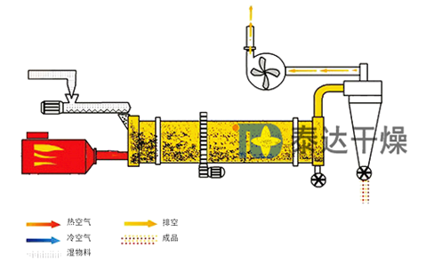 供料裝置進(jìn)入回轉(zhuǎn)滾筒的內(nèi)層,實(shí)現(xiàn)順流烘干,沙子在內(nèi)層的抄板下不斷抄起、散落呈螺旋行進(jìn)式實(shí)現(xiàn)熱交換,沙子移動(dòng)至內(nèi)層的另一端進(jìn)入中層,進(jìn)行逆流烘干,沙子在中層不斷地被反復(fù)揚(yáng)進(jìn),呈進(jìn)兩步退一步的行進(jìn)方式,沙子在中層既充分吸收內(nèi)層滾筒散發(fā)的熱量,又吸收中層滾筒的熱量,同時(shí)又延長(zhǎng)了干燥時(shí)間,沙子在此達(dá)到最佳干燥狀態(tài)。沙子行至中層另一端而落入外層,沙子在外層滾筒內(nèi)呈矩形多回路方式行進(jìn),達(dá)到干燥效果的沙子在熱風(fēng)作用下快速行進(jìn)排出滾筒,沒(méi)有達(dá)到干燥效果的濕沙子因自重而不能快速行進(jìn),沙子在此矩形抄板內(nèi)進(jìn)行充分干燥,由此完成干燥目的