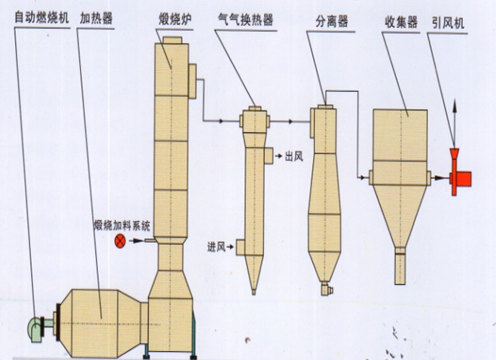 通常產(chǎn)用引風裝置系統(tǒng)處于微負壓,用直接或間接方式獲得熱源,煅燒尾氣采用旋風分離,空氣冷卻,袋式、靜電或水洗進行空氣凈化和產(chǎn)品回收。