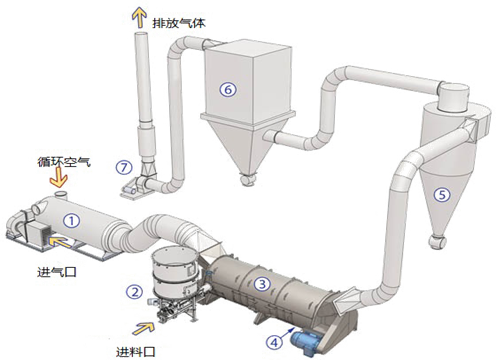 干燥機的熱源為燃油或燃氣熱風機,通常與干燥筒集成在一起。