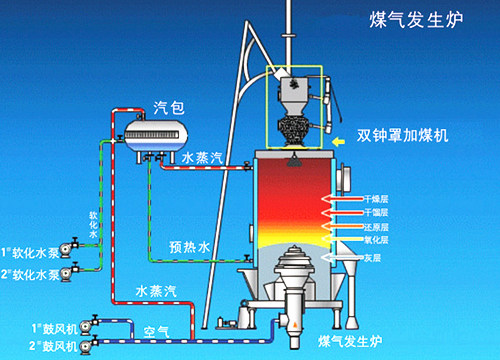 連續式煤氣發生爐以:0-80mm的粒煤為理想燃料,小顆粒煤在爐中,大大增加爐的氣化強度、加快反應速度、提高煤的氣化效率,使煤之中的炭與水蒸汽發生化學反應,形成一氧化碳和氫氣等可然體,從而達到完全氣化狀態,連續穩定的制造煤氣。
