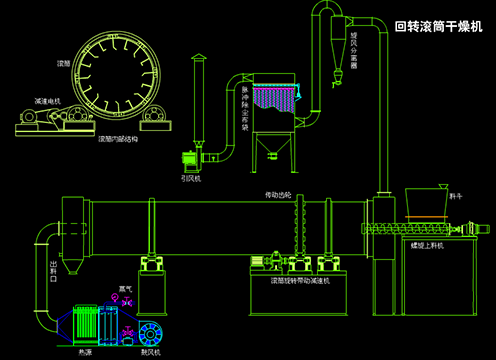 將含有水分的物料由皮帶輸送機或斗式提升機送到料斗,投入到烘干機的進料端,進料端口的螺旋葉片將物料推進到筒體內(nèi),筒體上的揚料板在筒體旋轉(zhuǎn)的作用下將物料揚起。因為筒體安裝有一定的傾斜角,在重力的作用下向低端的出料口移動。濕物料在筒體內(nèi)向前移動過程中,直接或間接得到了載熱體的給熱,使?jié)裎锪系靡愿稍铮缓笤诔隽隙私?jīng)皮帶機或螺旋輸送機送出。期間產(chǎn)生的廢氣和粉塵通過出料端的管路經(jīng)除塵器處理后排放到大氣中,有用物料進行收集。筒體上固定有兩個滾圈,滾圈分別放在兩個托輪裝置上??砍隽隙说耐休喲b置上還裝有一對擋輪,防止筒體在旋轉(zhuǎn)時作軸向移動。筒體的旋轉(zhuǎn)是傳動部分的電動機經(jīng)過減速機帶動小齒輪, 小齒輪與筒體上的大齒輪嚙合來實現(xiàn)的,大齒輪固定在筒體上。在筒體的兩端分別有進料裝置和出料裝置,他們通過密封裝置保證和筒體密封,不漏氣。